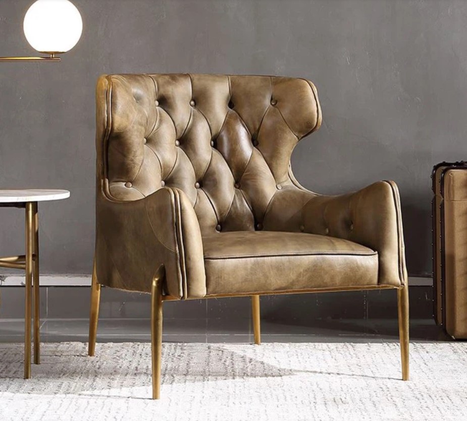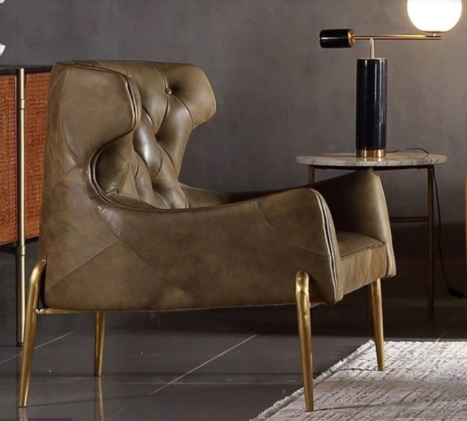 Unwind in unparalleled elegance with our Luxury Buttoned Leisure Chair, a harmonious blend of opulent comfort and modern industrial design. Expertly upholstered in premium top-grain leather and resting on sleek brushed metal legs, this chair is a testament to refined craftsmanship and timeless sophistication. Where Modern Luxury Meets Timeless Comfort – Perfectly suited for a smoking lounge, executive office, or chic living room, this statement piece balances bold sophistication with inviting comfort.